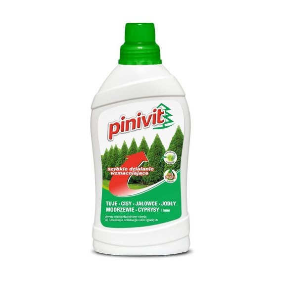 Pinivit - nawóz do Iglaków. Do dolistnego nawadniania - 1litr Pinivit to skoncentrowany, wieloskładnikowy nawóz płynny całkowicie rozpuszczalny w wodzie.Pinivit przeznaczony do dolistnego nawożenia roślin iglastych. Pinivit zawiera niezbędne makro- i mikroelementy zestawione w proporcjach zapewniających harmonijny wzrost i rozwój roślin iglastych. Dzięki temu rośliny osiągają znacznie większe przyrosty, uzyskują ładniejsze wybarwienie igliwia i poprawę zdrowotności, a także są bardziej odporne na wszelkiego rodzaju stresy.