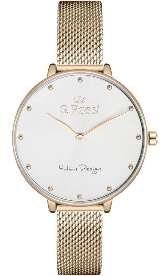 Złote wskazówki i logo G.Rossi z koroną nadają całości szlachetności, a bransoleta typu mesh o szerokości 12 mm oplata nadgarstek jak elegancka, złota wstęga, łącząc wygodę z ponadczasowym stylem. Ten zegarek jest wyrazem wyrafinowanego minimalizmu - doskonały dla kobiet, które szukają czegoś wyjątkowego, a jednocześnie subtelnego. G.Rossi 11890B3-3D1 to nie tylko czasomierz, ale i biżuteria, dodająca blasku każdej chwili.