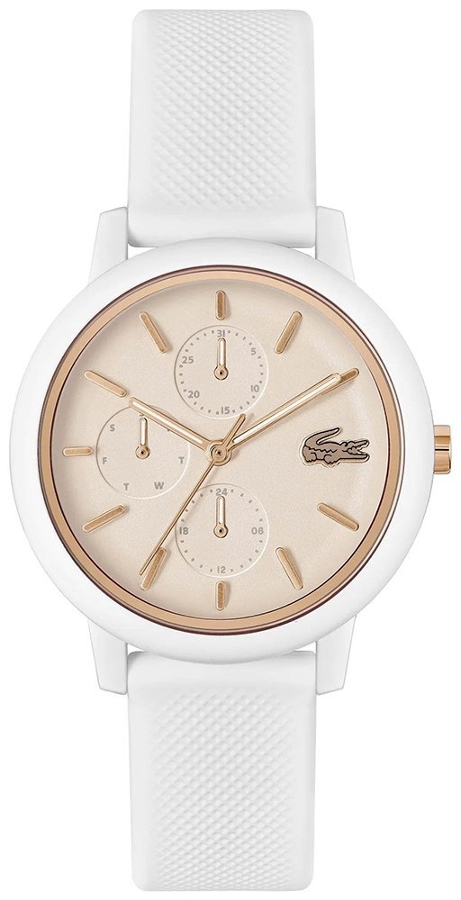 Biała koperta, czysta jak świeży płatek śniegu, to doskonała baza dla tarczy w metalizowanym odcieniu szampana, której subtelny połysk intryguje niczym bąbelki w kieliszku dobrego wina. Całość otula pierścień w różowym złocie, wprowadzając ciepło i kobiecość, jak delikatny muśnięcie różu na policzkach. To doskonały kontrast dla chłodnej bieli, który przyciąga spojrzenia jak magnes.Wskazówki i sekundnik, również w różowym złocie, krążą po tarczy niczym wirująca sukienka na parkiecie - eleganckie, a zarazem lekkie, z wdziękiem prowadzą przez każdą chwilę. Każdy ruch tych detali to subtelna symfonia precyzji i stylu, która nie pozwala oderwać wzroku. Biały, teksturowany pasek nie tylko zapewnia wygodę, ale też wprowadza nowoczesny twist, łącząc sportowy vibe z wyrafinowaną klasą. Sprawia, że ten zegarek idealnie balansuje między codzienną lekkością a szykowną elegancją. A te detale - logo Lacoste na godzinie trzeciej, koronka i sprzączka w różowym złocie - to prawdziwa biżuteria wkomponowana w czasomierz.