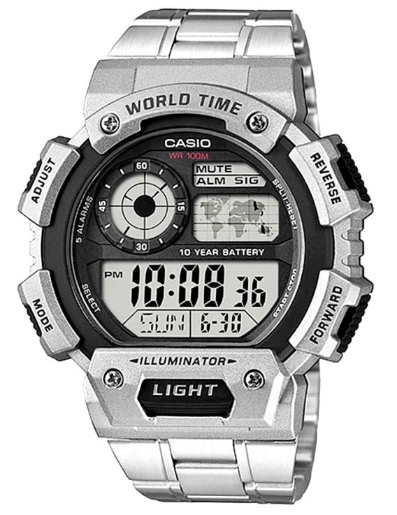Dzięki 5 alarmom dziennym lub jednorazowym oraz sygnałowi godzinowemu zapewnia pełną kontrolę nad czasem. Podświetlenie LED z możliwością wyboru czasu świecenia i efektem poświaty w bursztynowym kolorze ułatwia korzystanie w ciemności. Pełny kalendarz automatyczny działa aż do 2099 roku, a funkcja wyciszenia pozwala na wyłączenie dźwięków przycisków. Dokładność zegarka wynosi ±30 sekund na miesiąc, a dodatkowe funkcje obejmują format 12-/24-godzinny oraz standardowe wskazanie czasu (godzina, minuta, sekunda, PM, miesiąc, data, dzień tygodnia).