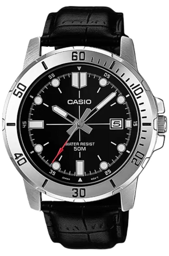 Model męskiego zegarka CASIO stanowiący połączenie sportowej funkcjonalności i klasycznej formy. Stalowa koperta o średnicy 44 mm skrywa głęboką, czarną tarczę o satynowym wykończeniu, którą dopełniają białe indeksy i masywne wskazówki - wszystko stworzone z myślą o maksymalnej czytelności. Czerwony grot sekundnika dodaje zegarkowi nuty dynamiki i nowoczesnego charakteru. Na wysokości godziny trzeciej znajduje się funkcjonalny datownik, a bezel z minutową podziałką ułatwia odmierzanie czasu. Wodoszczelność do 50M sprawia, że zegarek poradzi sobie nie tylko w biurze, ale i w ruchu. Całość osadzona jest na klasycznym, czarnym pasku z tłoczonej skóry - wygodnym, dopasowującym się do nadgarstka i idealnym na każdą okazję, od spotkania służbowego po wieczorne wyjście