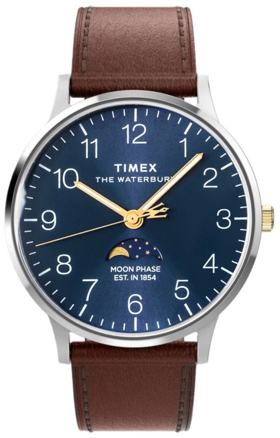 Przedstawiamy najnowszą odsłonę modelu Timex Waterbury Classic, teraz wyposażoną w zaawansowany kwarcowy mechanizm z fazami księżyca, który w elegancki sposób śledzi cykl lunarny na subtarczy umieszczonej tuż nad godziną 6. Niebieska tarcza typu sunray została wzbogacona o pełne cyfry arabskie oraz świecące w ciemności wskazówki, całość chroniona jest szkłem mineralnym. Srebrzysta koperta ze stali nierdzewnej o średnicy 40 mm idealnie współgra ze złotą koronką i brązowym paskiem z naturalnej, ekologicznej skóry (pozyskiwanej zgodnie ze standardami Leather Working Group), wyposażonym w szybkozłączki. To elegancka komplikacja faz księżyca nie tylko wzbogaca wygląd tarczy, ale też dodaje zegarkowi klasy i funkcjonalnego uroku - szczególnie dla miłośników astronomii i ponadczasowego designu.